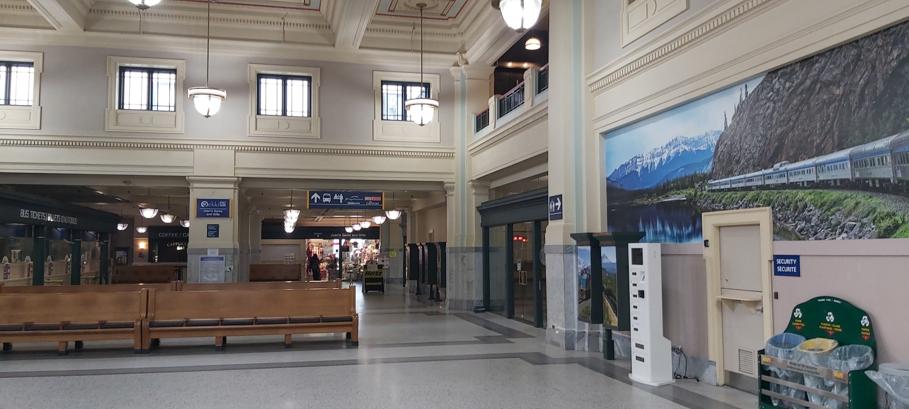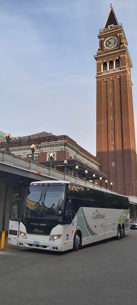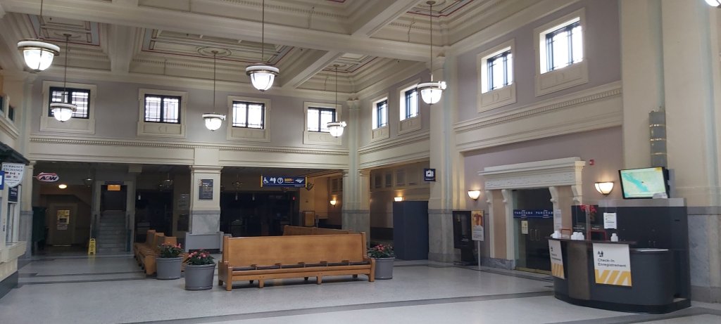 Once again, I’m in the Cactus Club, still doing a roaring trade at 2.45 pm. I had the same for lunch as dinner the night before, to avoid spending now limited time perusing the menu. And, I made it back to the hotel by 3 o’clock to pick up my luggage and take a taxi to the Pacific Central Station from where the Amtrak bus to Seattle would be waiting. The railway station has seen better days, and if you had travelled from Toronto on The Canadian, you might feel underwhelmed after such a wonderful journey. The building itself is splendid but lends itself to careful restoration.