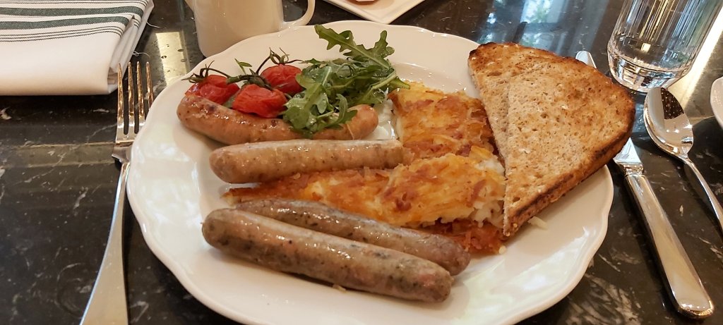 I am always being reminded that “you cannot take it with you” when debating an extravagance. With this in mind, I decided on breakfast at the hotel. Unlike the hotel in Vancouver which offers both hot and continental buffet options, here in Seattle, just à la carte is available. Nevertheless, the cooked option with toast and coffee was generous in size, and should see me through to late afternoon.
