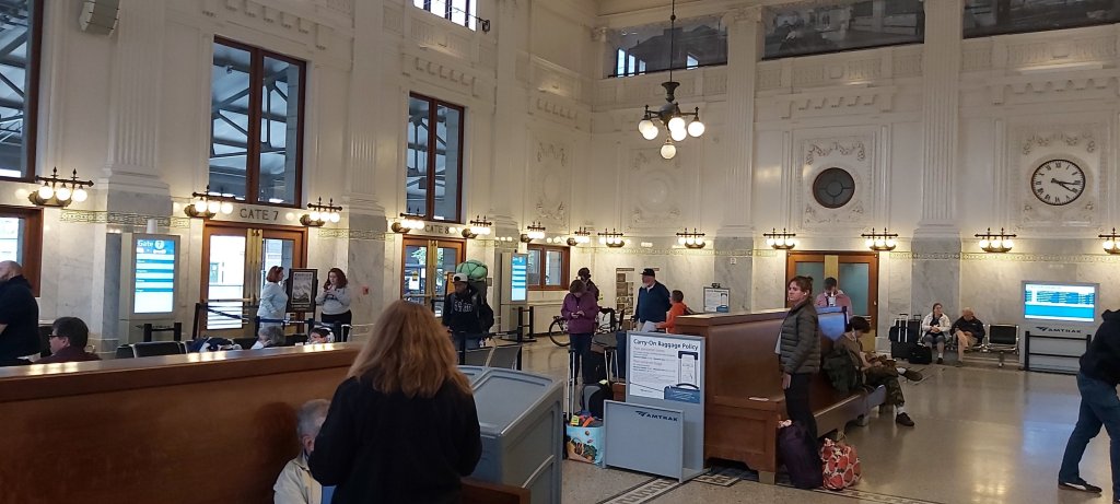 I enjoyed my unplanned exploration of the world famous (so I’m told) Public Market around Pike and Pine Street, which really is massive and impressive. So engrossed was I that I only left just enough time to get comfortably to Seattle’s surprisingly impressive King Street Station. Just like at Vancouver, there was a substantial gathering of passengers for the train, some with “impossible” baggage. We entered at Gate 7, where the Seattle portion of The Empire Builder, around 5 vehicles and one loco was waiting at a nearby platform, not platform 7! The Empire Builder also runs from Portland Ohio, the two sections attaching after our arrival at 12.40, in time for the scheduled departure for stations to Chicago at 1.25 am.