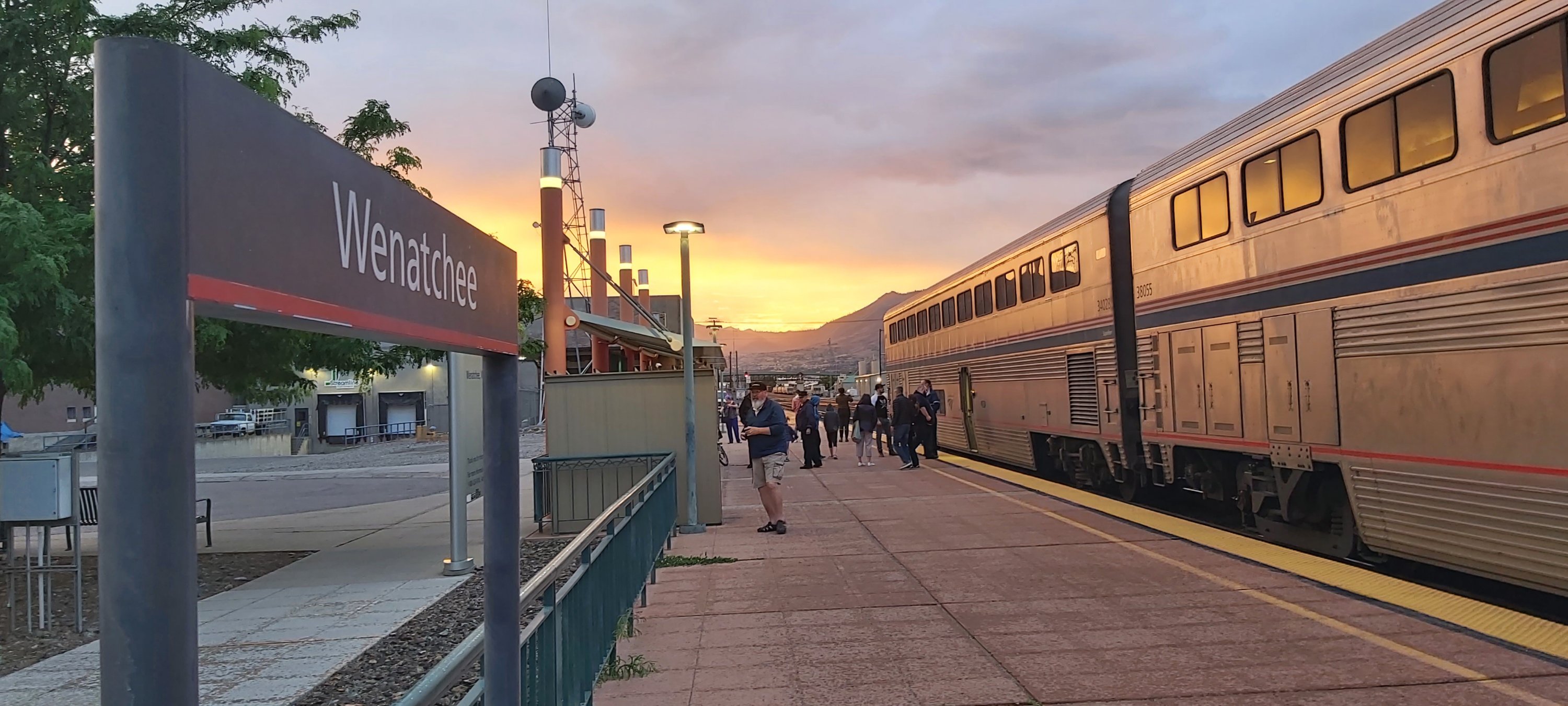 During the journey over three days, i.e. Seattle depart Saturday at 4.40 p.m., Chicago arr. Monday at 3.55 pm, there are six (what are sometimes referred to as) “smoke stops” where passengers can step off the train, in my case, for fresh air. This was the first such stop at Wenatchee WA at 8.42 pm.
