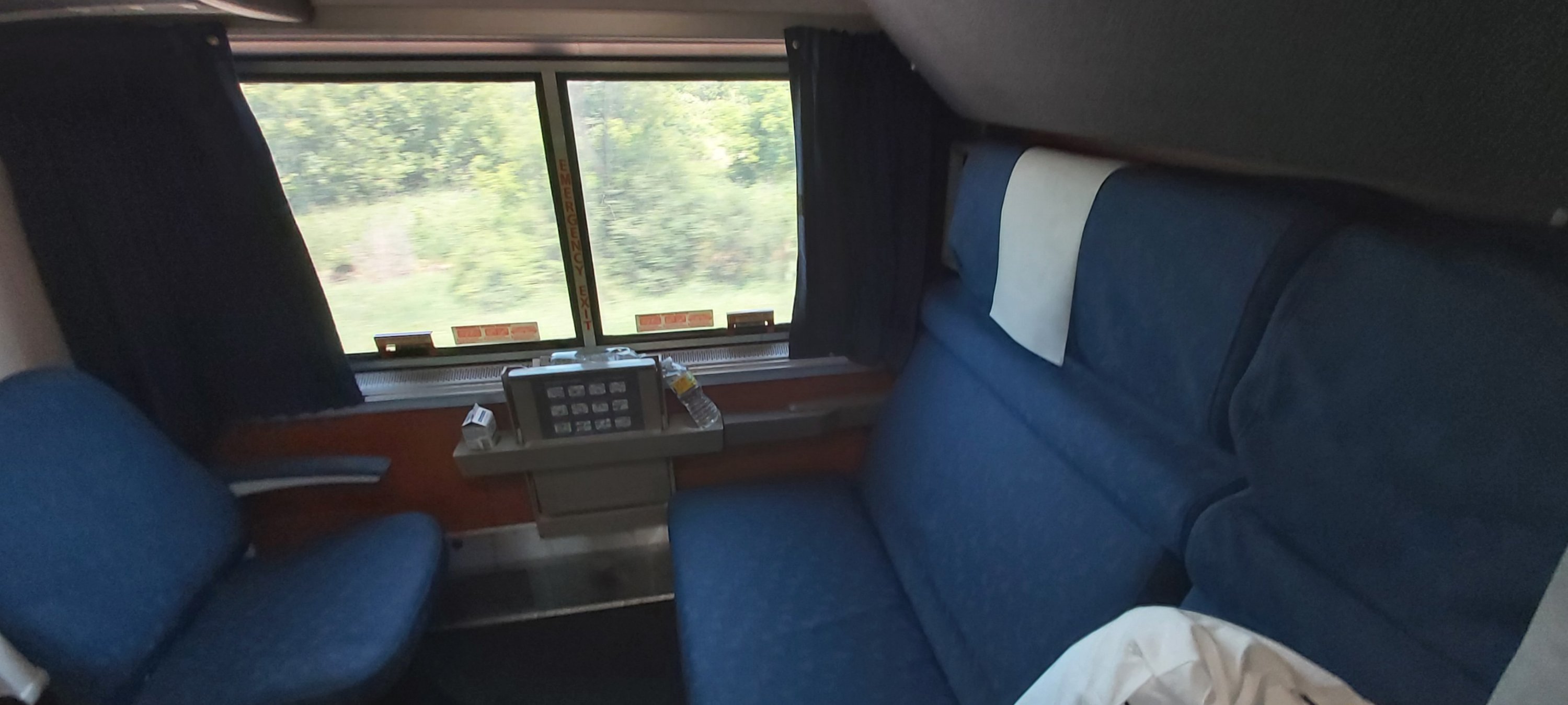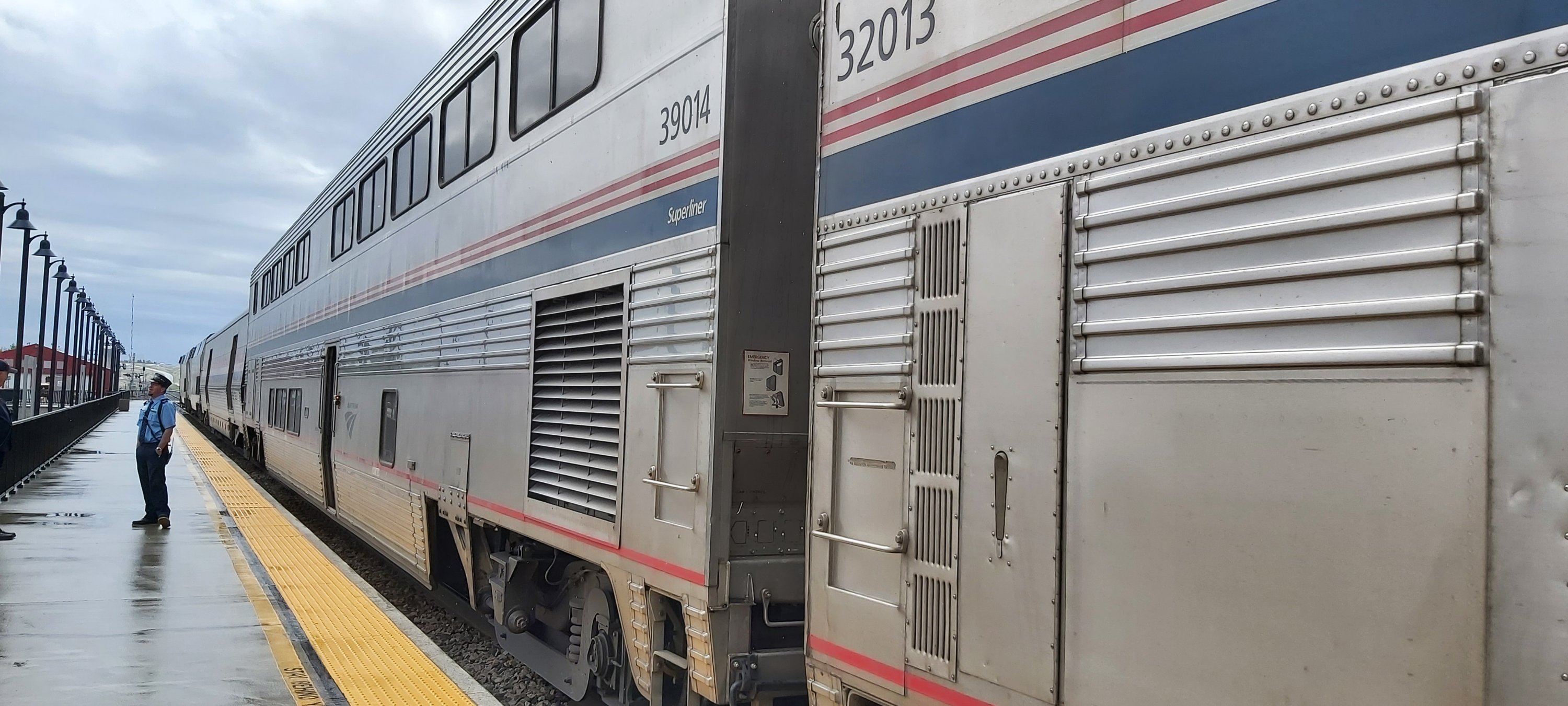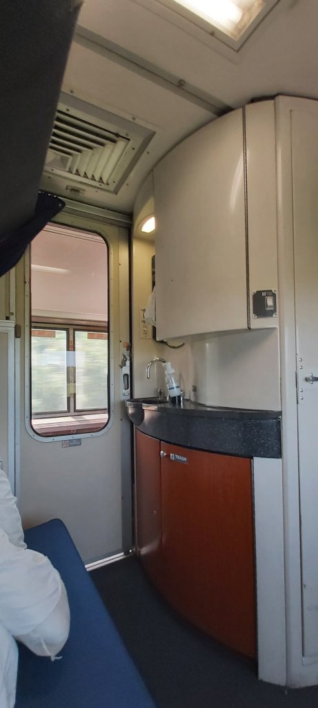 I have made two expensive but wise decisions on this trip. One was to have the big blue suitcase transferred to Queen Mary 2, and the other was to book bedrooms for the overnight train journeys, rather than the more sensible roomettes with next to no space, but a decent bed, nonetheless. I had experienced something similar on The Ghan in 2019. The Bedroom on Amtrak is spacious, particularly in day-time mode. However, I wouldn’t like to share with anybody else. 48 hours will tell whether I still enjoy very long distance rail travel. Certainly the first few hours out of Seattle were fabulous, starting with running parallel to Alaskan Way along which I walked yesterday. Then we were along the water’s edge for several miles, as people waved at us from the shoreline.