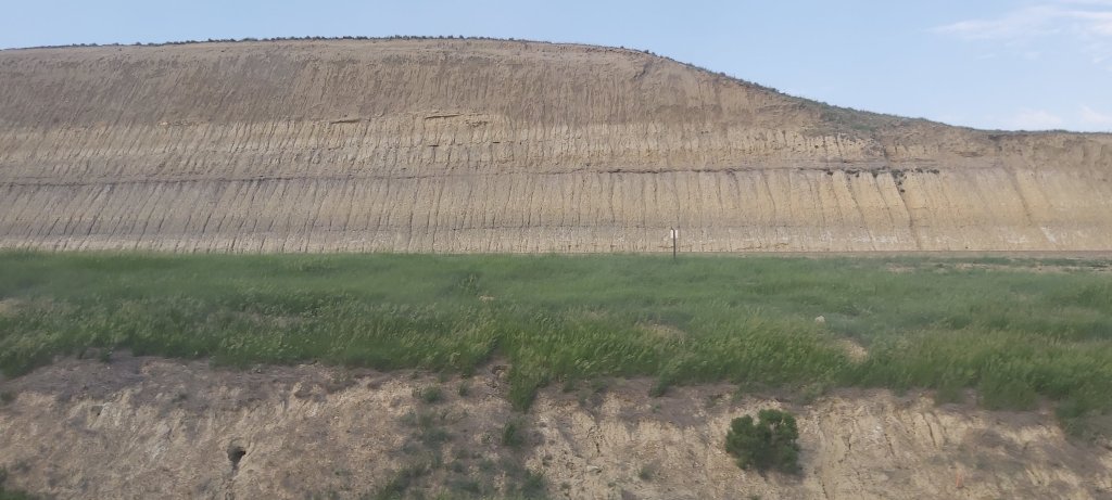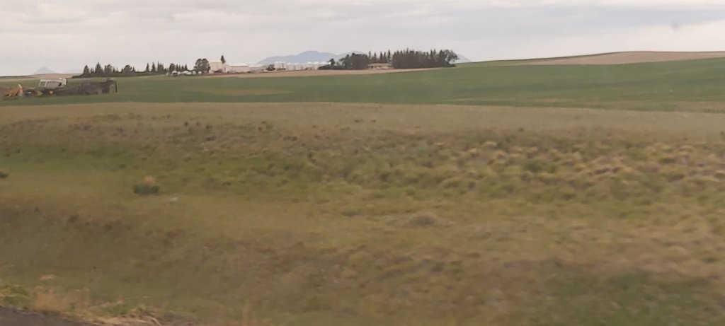 19/6/22. 10.46 hrs19/6/22 10.52 hrsAlso 10.52 hrs10.54 hrsView from the Empire Builder, 10.59 hrs. 19/6/22. As ever, I didn’t get up early, and thus missed seeing a private train when we stopped at Whitefish MT on time at 07.21 hrs. If I get to ride this train a second time, it will be in the opposite direction, from Chicago, so as to see the fabulous scenery I slept through last night. Please note, apart from the off-train fresh air/smoke breaks, photographs are taken through tinted windows and are subject to reflection from inside.12.25 hrs 20 minutes’ break at Shelby, Montana (MT) Inverness, Montana. 13.20hrs. The landscape flattens out with occasional mountain ranges on the horizon.