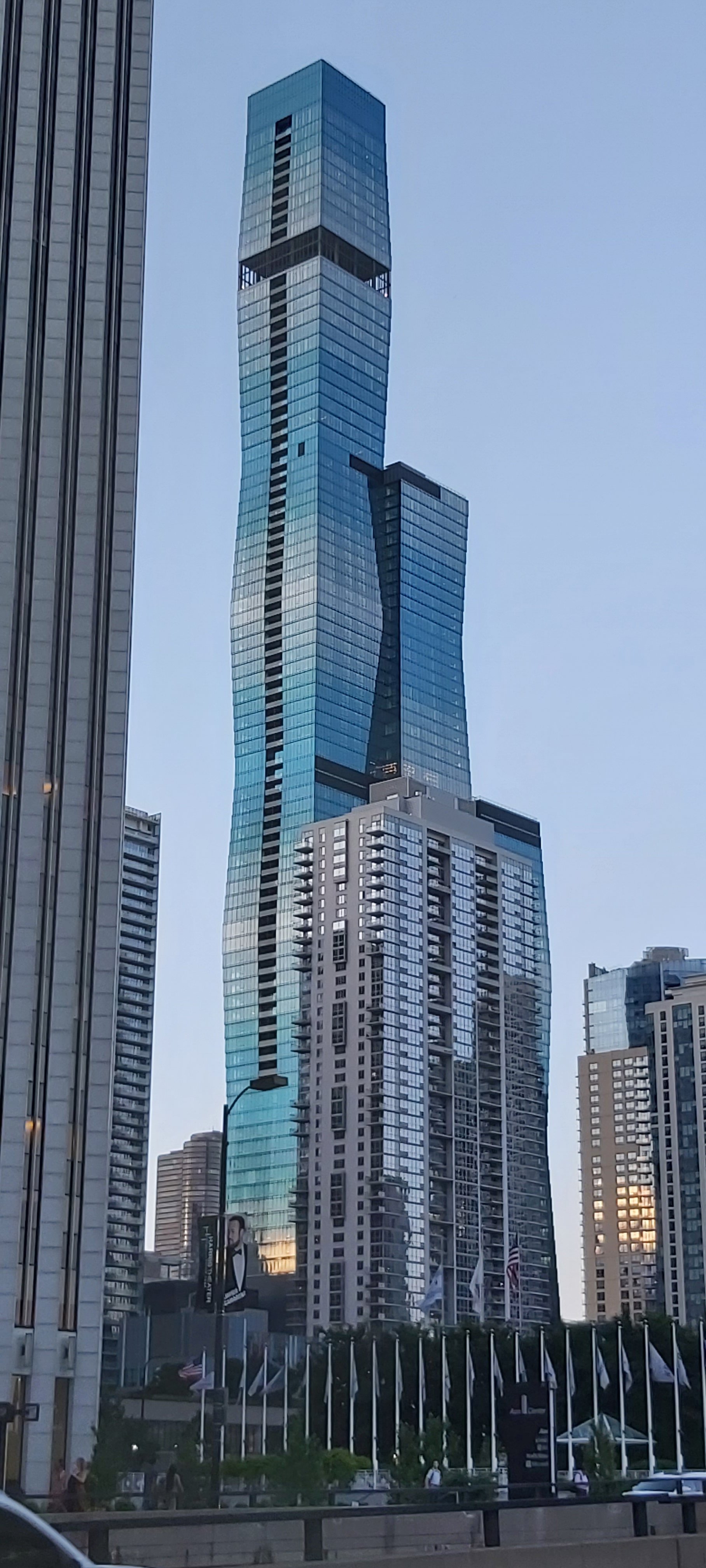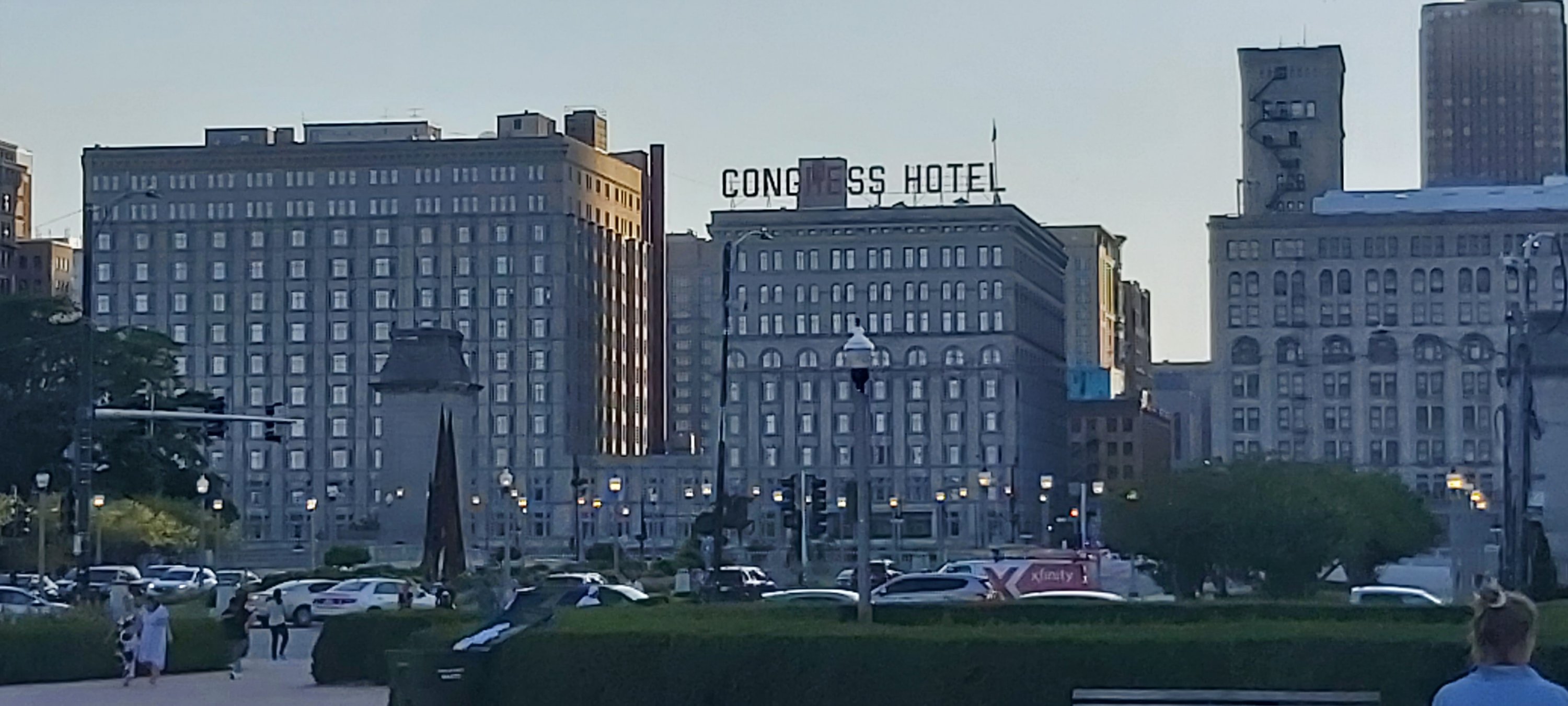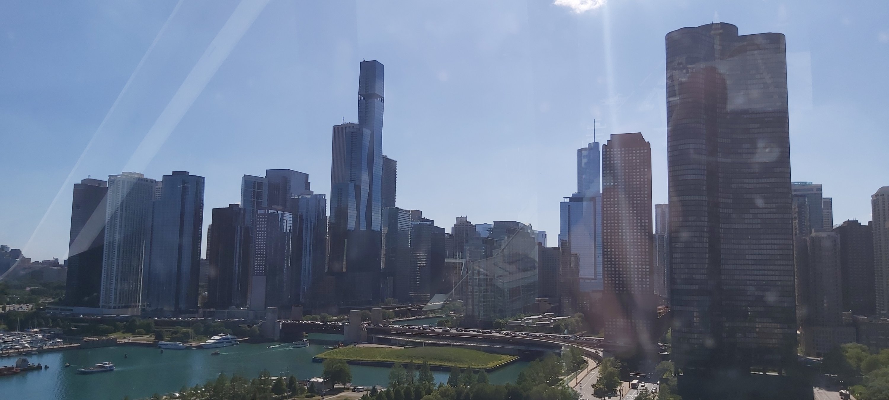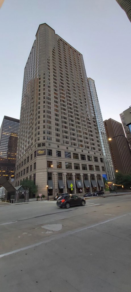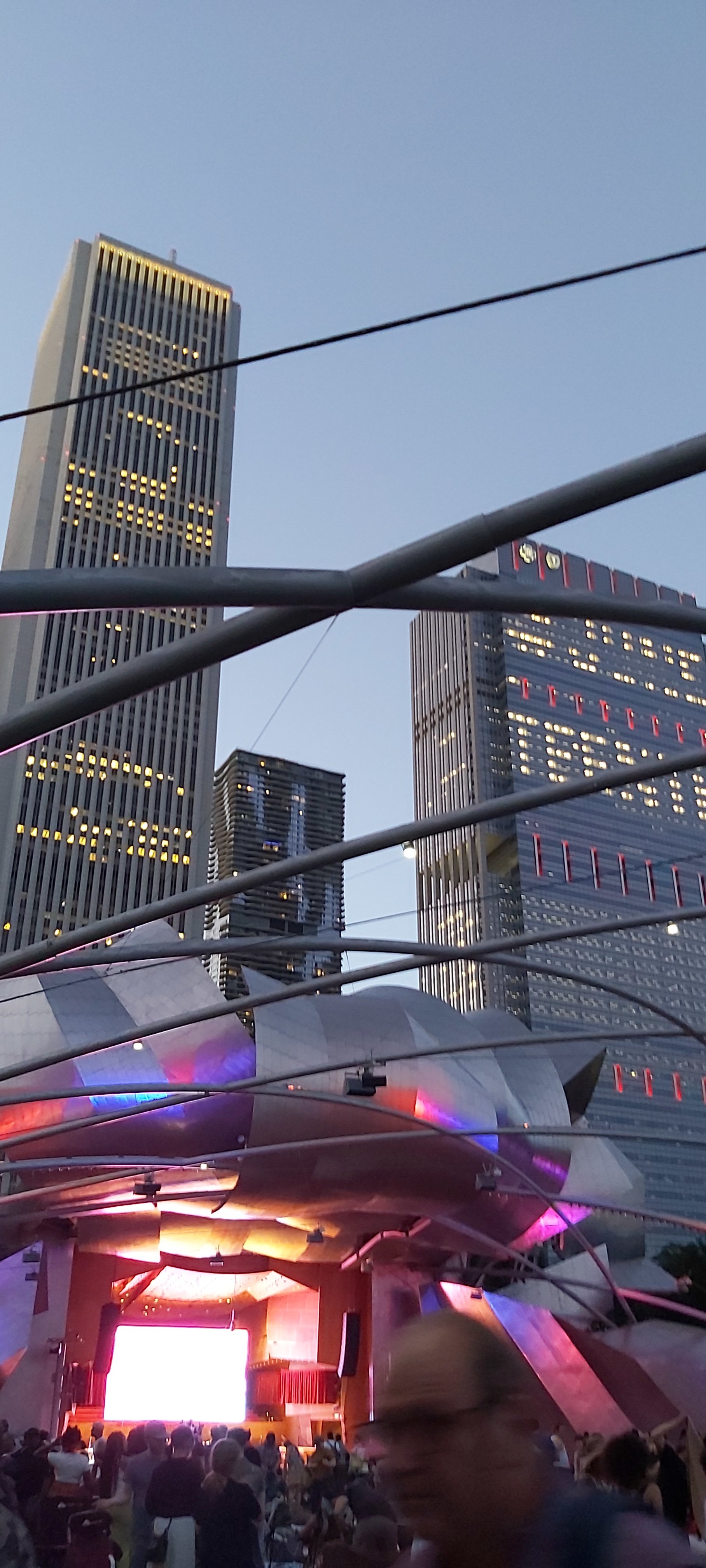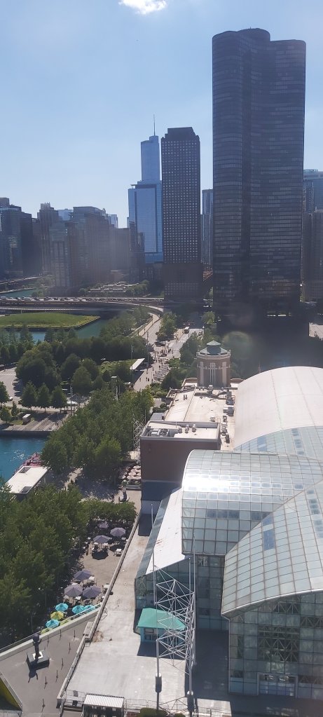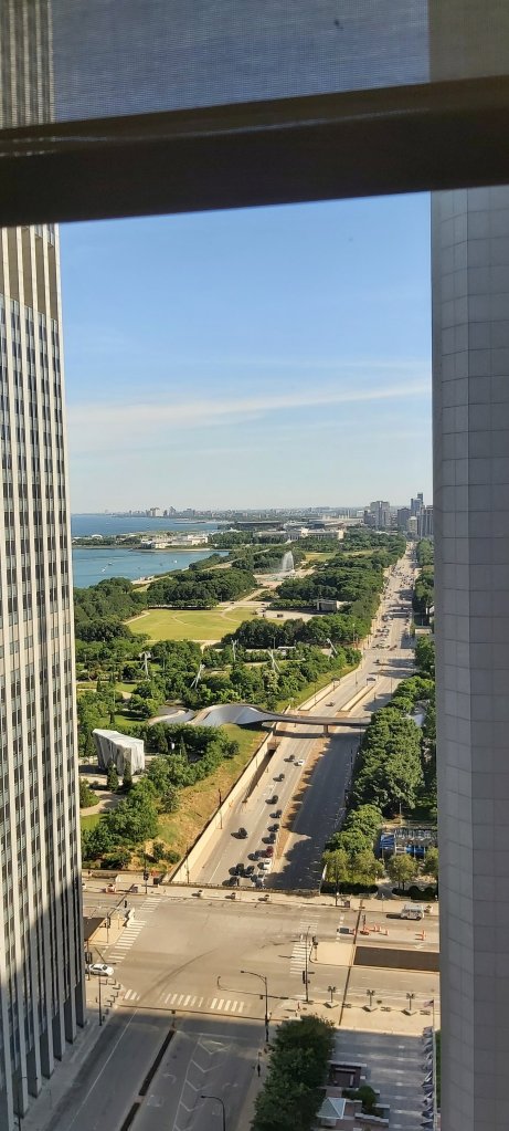 I did wander off from the Hotel after the turkey sandwich which actually, I doubt I will be choosing again! Once outside, even after the sun had gone down, it was sweltering, just as I remember from over 50 years ago. The fountain which I can see from my room is further than I thought, and I got nowhere near! I did get to the last bars of an amazing pop concert in Millennium Park. There’s a joyous atmosphere outside and my head still thinks it’s in its twenties! My tired old body reminds me otherwise. Chicago does not disappoint. But the 37 floors of my hotel are dwarfed by the giant high rises surrounding it.