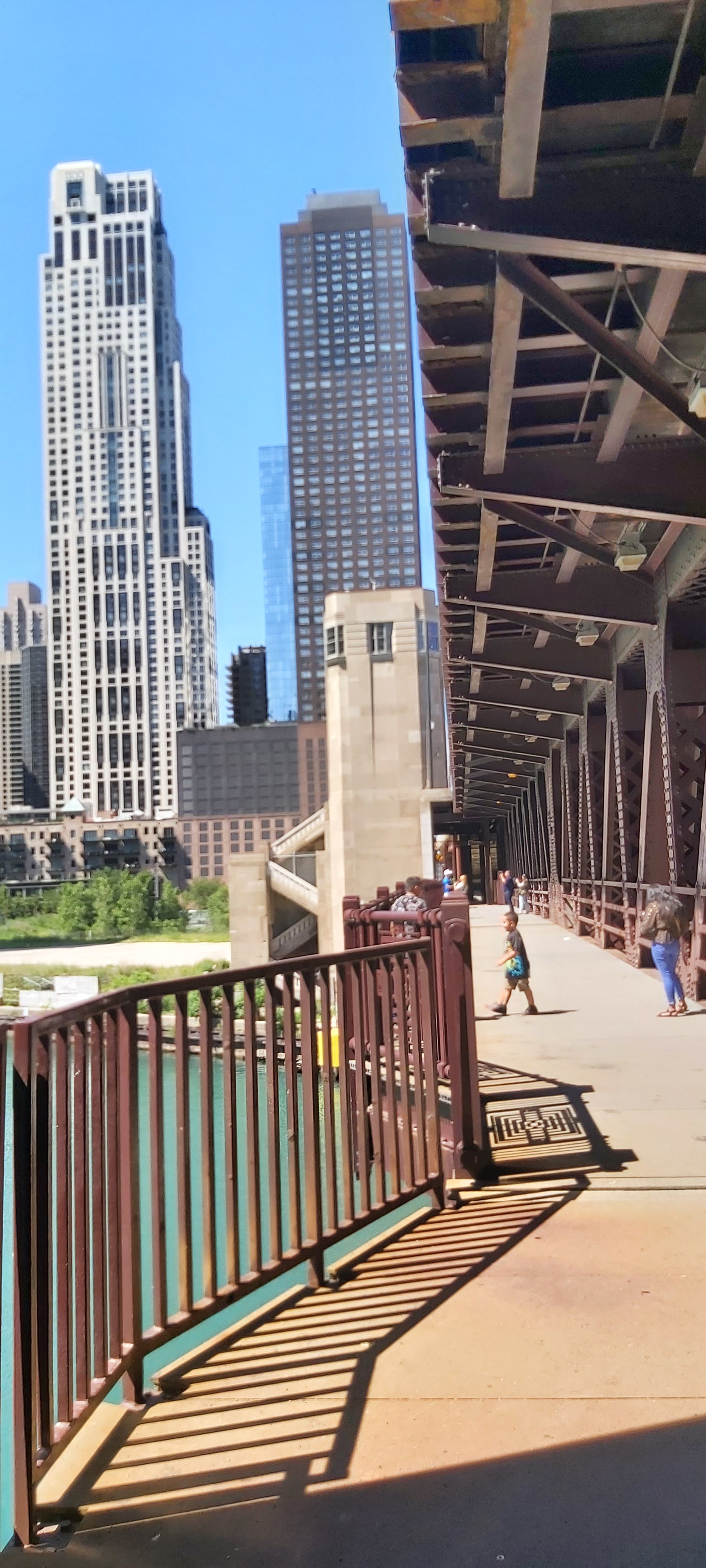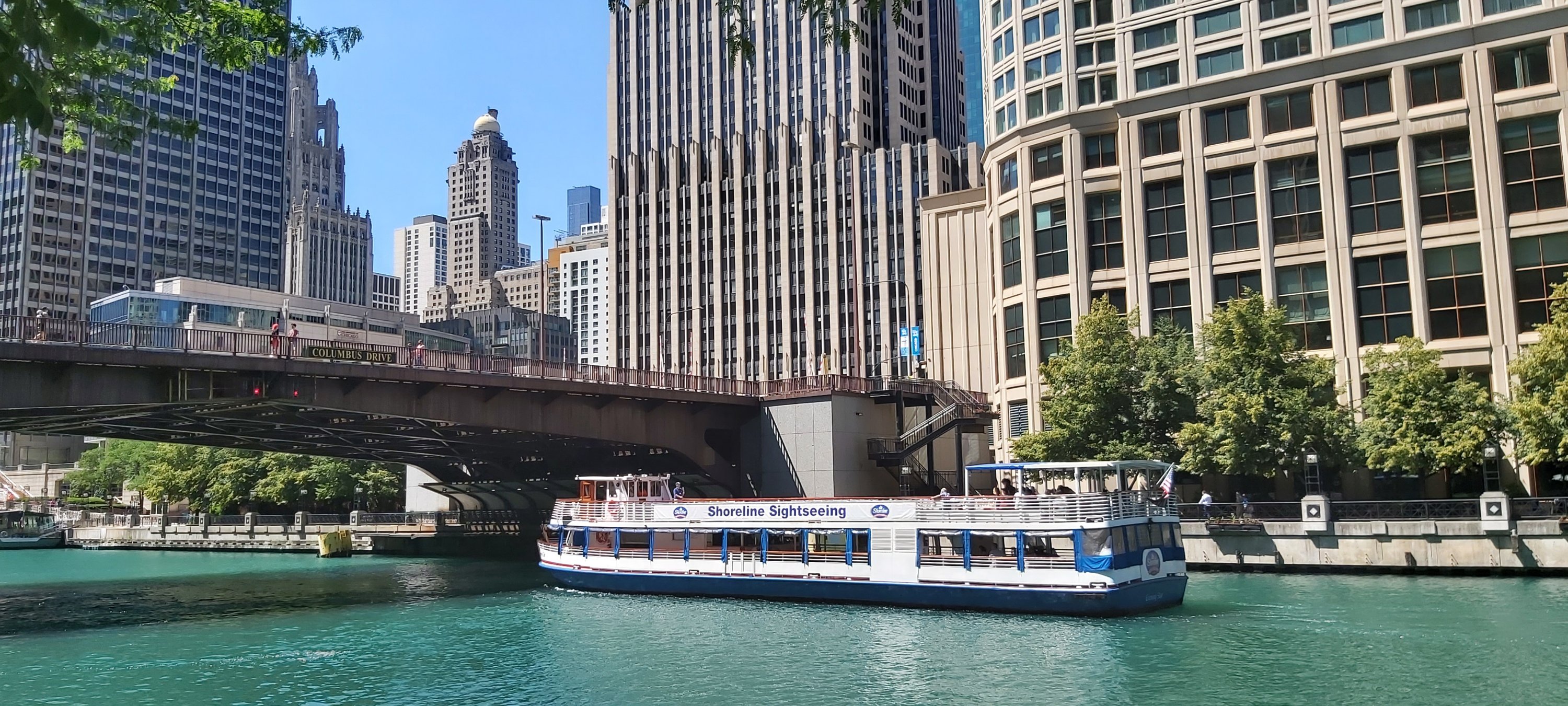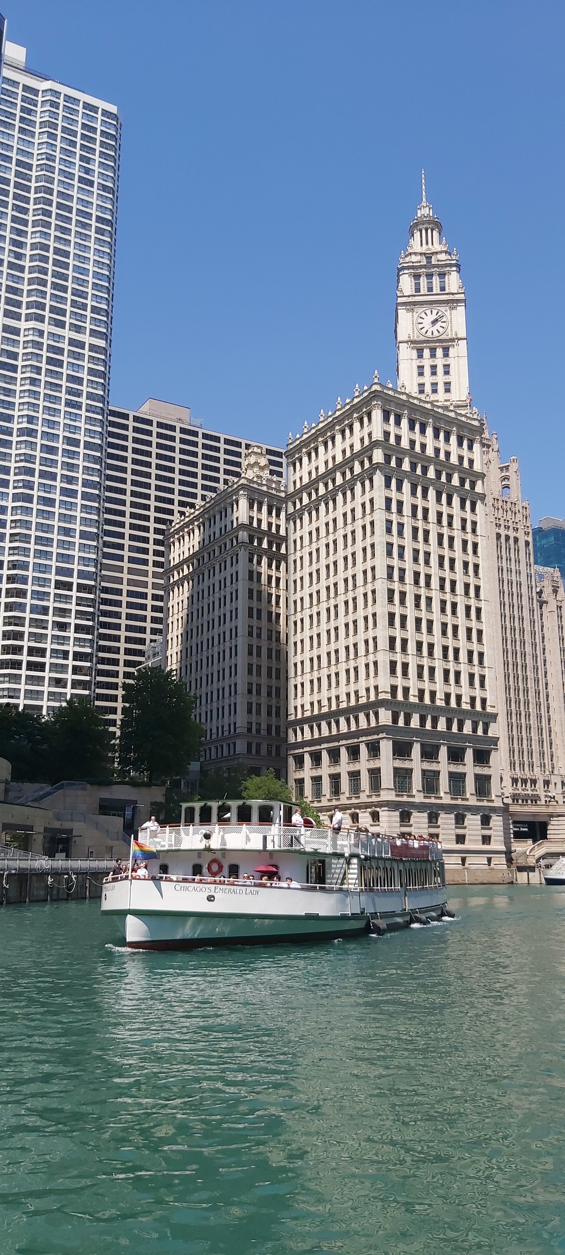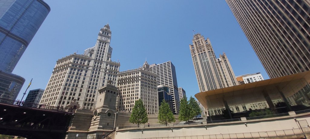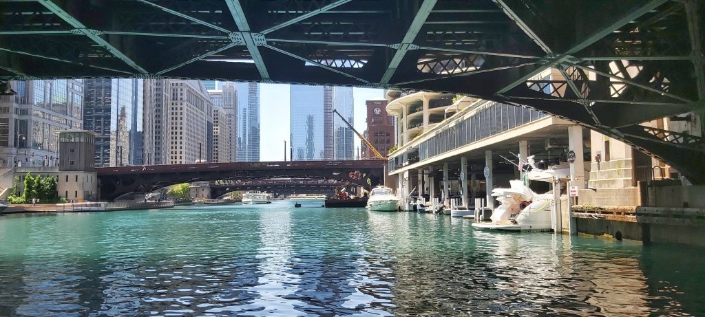 I took a river trip after a rather late breakfast, and enlightening natter with the Hotel Concierge. This boat trip is run regularly, several times each day, by the Chicago Architecture Foundation Center, with the excellent tour guide describing as many notable buildings as possible, complete with details of when built, who for, and the designer and architect etc. So many facts and figures in such a short time are, for me anyway, almost impossible to remember. I’m sure there’s a book on the subject, and there’s also Google. However, if I’m not mistaken, we went under 25 bridges, 4 of which were of two decks. The intense heat of the day didn’t detract, and taking a river cruise is a good way of seeing as much as possible, even if rather briefly.
