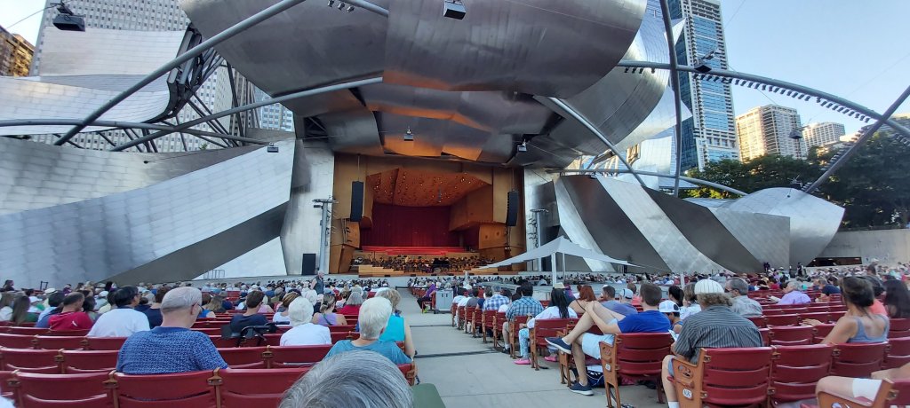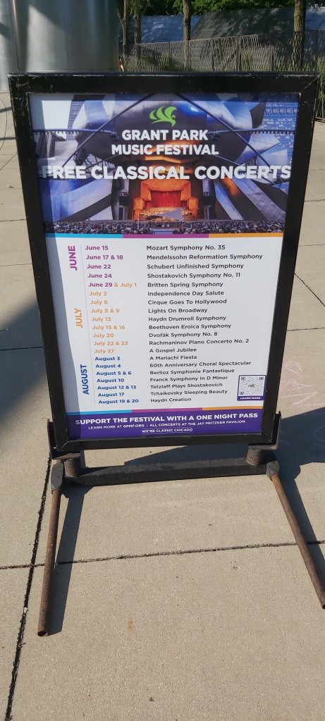 I could have walked back, but may have missed the start of a concert I had seen advertised yesterday. It was a brilliant symphony concert given by the Grant Park Orchestra, every bit as good as any I have heard. The problem with open air concerts are the distractions of hovering helicopters, aeroplanes flying over, the wail of emergency vehicles and other background disturbances. Having said that, I would readily return for more of the three month programme and pay (as I intended doing this time) to sit nearer the stage. The rendition of Tchaikovsky’s Fantasy Overture to Romeo and Juliet was as poignant and powerful as any I have heard. Schubert’s Unfinished Symphony was the main work, the concert opening with Beethoven’s Egmont Overture. The programme was altered because the conductor had tested positive for covid-19 and had to book sick. In between these familiar works, there was a piano sonata for two pianists who interpreted the ultra modern work in such a spectacular way as to earn a standing ovation.