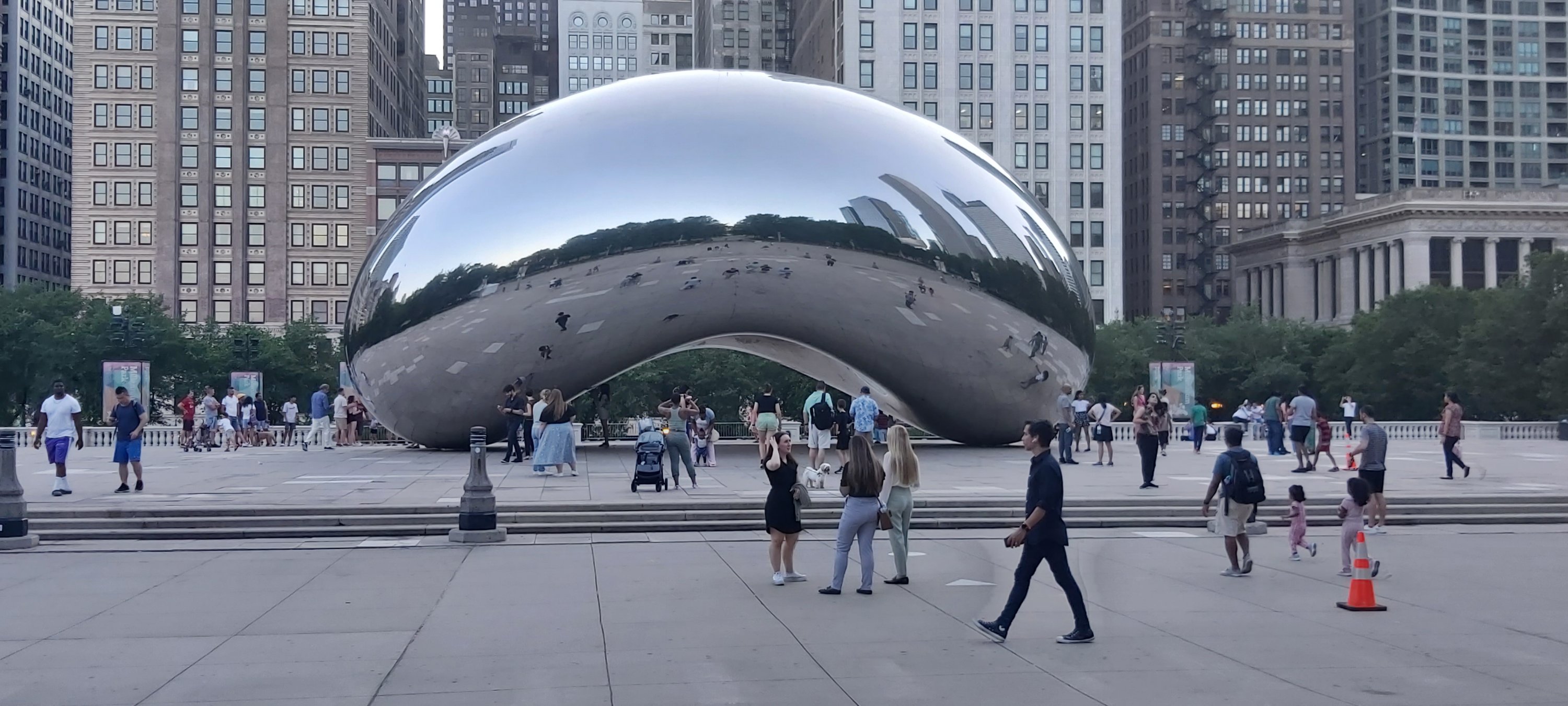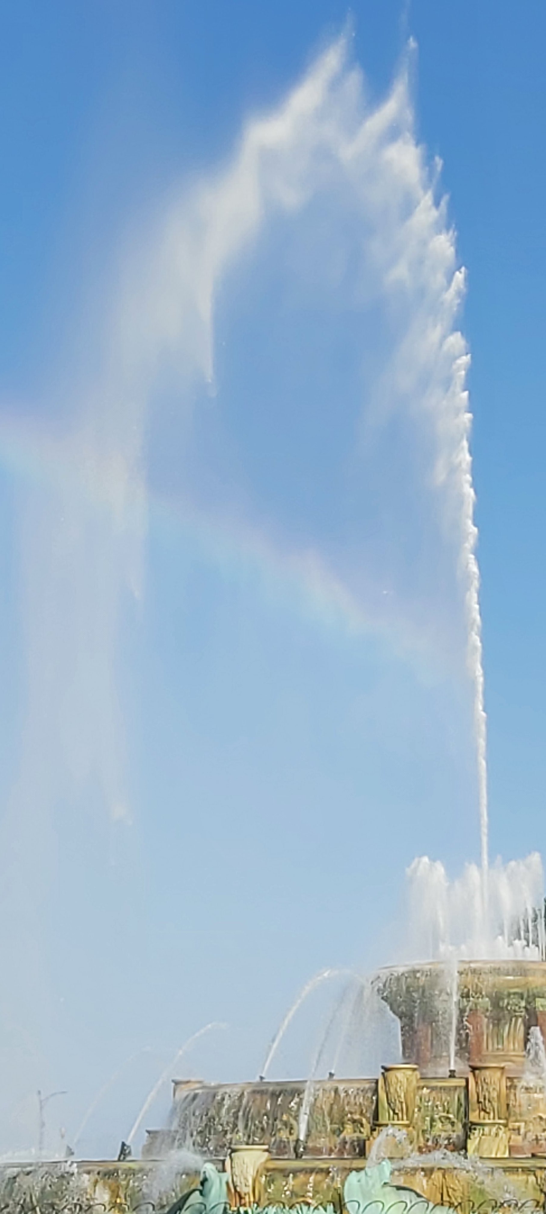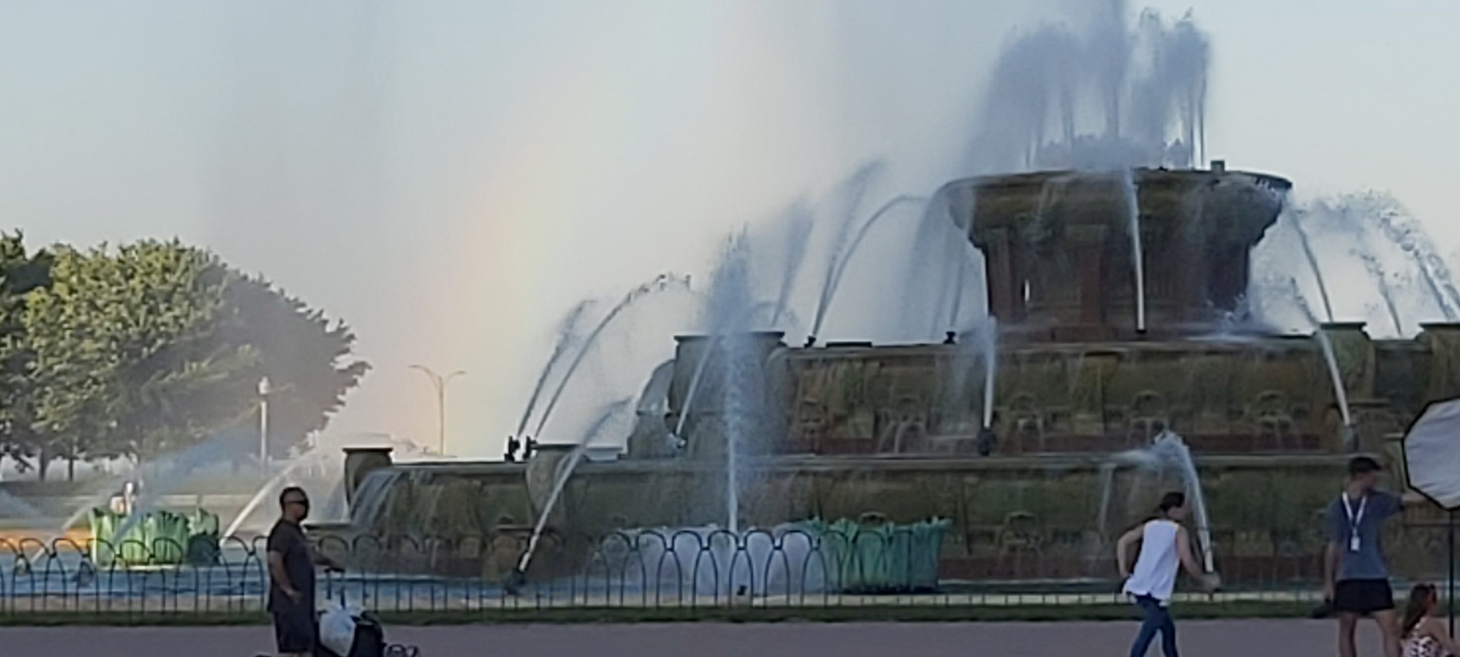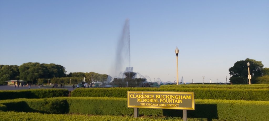Today, it is sunny with clear skies, and temperatures reaching an overwhelming 36°C while on the boat. For some reason, 37° is forecast for 4 o’clock. That is a heady 98.6° Fahrenheit, or recognised body temperature. I needed to return to my room for a break from the heat; it was so hot that I was advised not to use my camera phone. A little sign pops up on my screen with this advice. Nevertheless, I still managed enough images on both this and the Lumix. Returning to the Hotel provided also an opportunity to recharge the batteries which seem to deplete much faster than usual, and also partially reorganise the packing. Suitably refreshed, I decided to walk to what I would learn later is the Clarence Buckingham Memorial Fountain. Going in the late afternoon or early evening is a good idea. There is a good chance that the setting sun can create a rich rainbow in the fountain’s spray. I over-did the photographs!