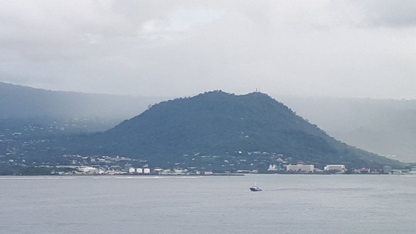 The little I saw of this spectacular island was lovely beyond compare. Away from the shore, the land rose into vegetation covered hills and mountains. Rainfall is frequent and plentiful, but we dodged a good soaking all day. From the ship, one could see distant rainfall on the hillsides, as seen in the pictures which come with this blog. A photo stop was made at Plum Pudding Rock, and then at the church of St. Peter, and school at Falefa Village.