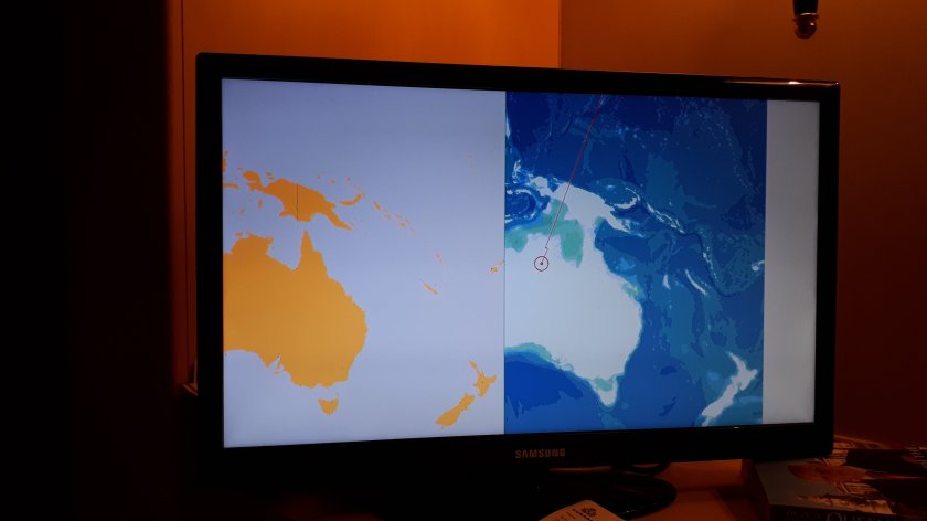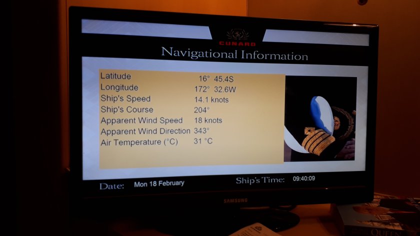 This morning’s air temperature is given as 23 degrees Celsius, similar to yesterday. Gentle rumblings of the cabin floor indicate the calmer sea our Captain promised yesterday in his Noon address. (Written between 9 and 9.15 this morning, 21/02/19).