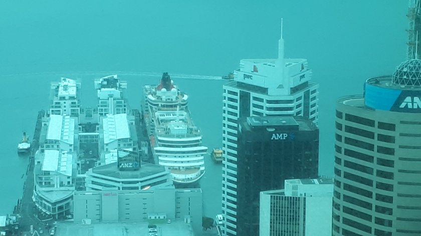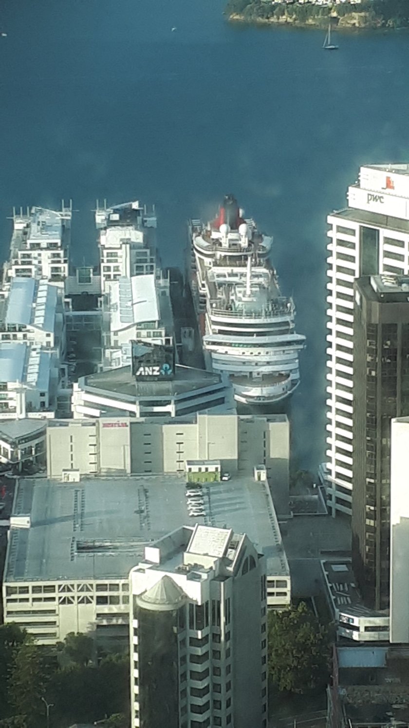 At the end of a “landmark day”, I am writing this blog in the cafe of Auckland’s Sky Tower on the 51st floor. Below me, clearly in sight, MV Queen Victoria, where the “All Aboard” time is 21.30hrs. However, seeing it there, I have that dreaded feeling I might see it slip its moorings. Now that would be embarrassing….not so much an applause, but a standing ovation! While I have never missed a cruise ship, a Holyhead ferry to Ireland sailed without me; rail chaos at the start of a summer timetable had me stranded at Crewe….I gave up and came home again! My “date” in Belfast (or was it Dublin?), abandoned!