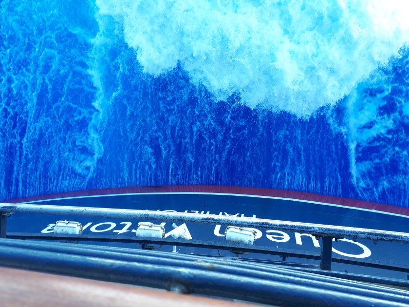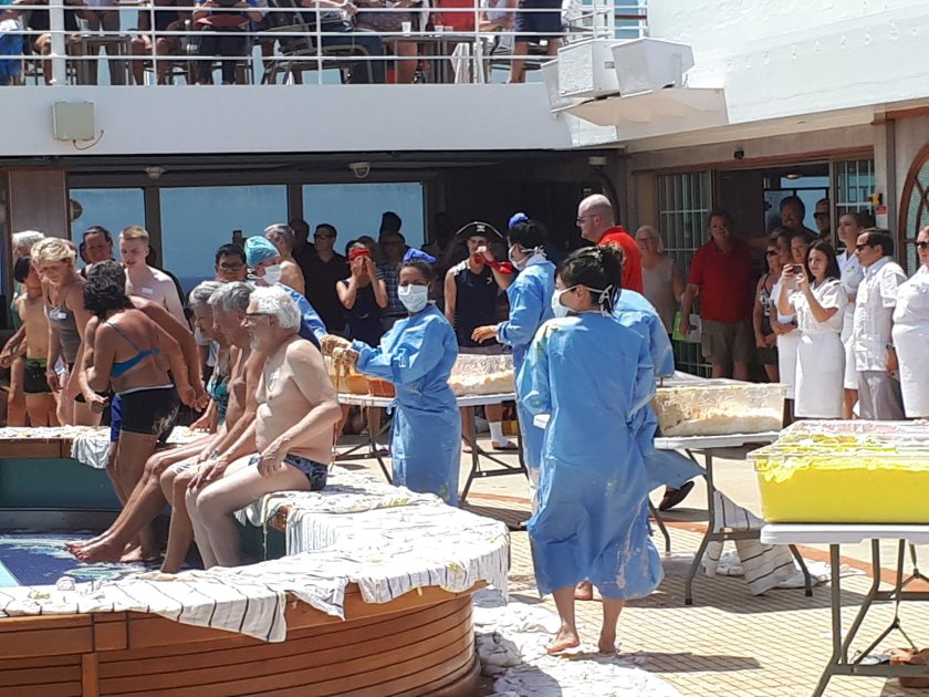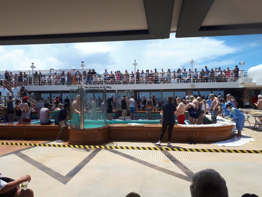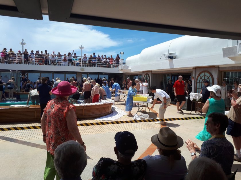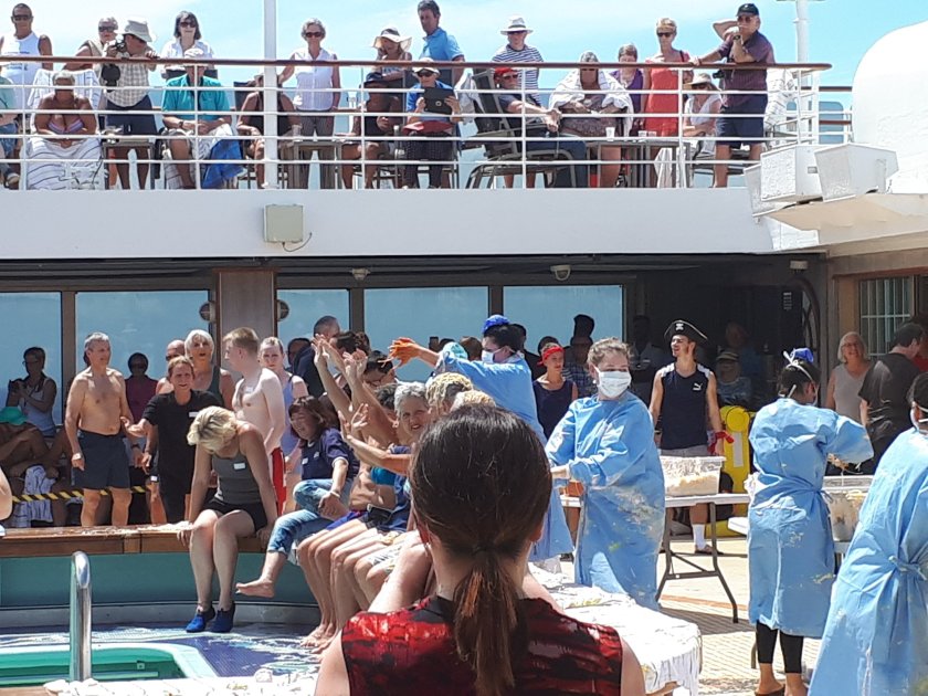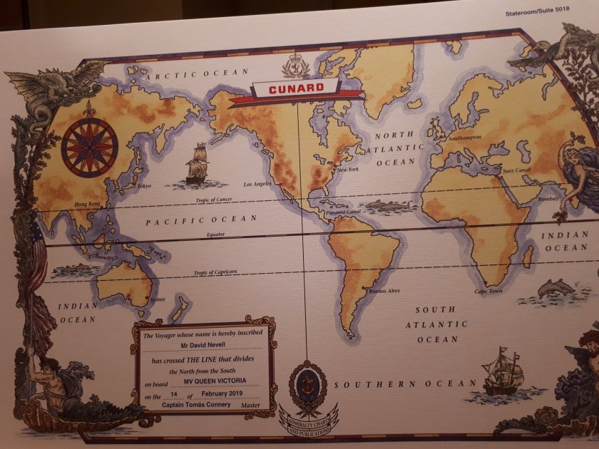 This afternoon, 16th February, there was the belated Crossing the Line ceremony. One of our table companions volunteered for his first Crossing the Line ritual humiliation, as did what seemed like several hundred others. I videoed much of this (rather clever) nonsense. Apparently, MV Queen Victoria crosses the Equator four times on this world voyage.