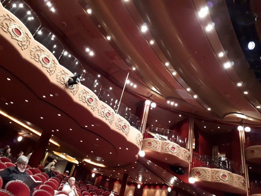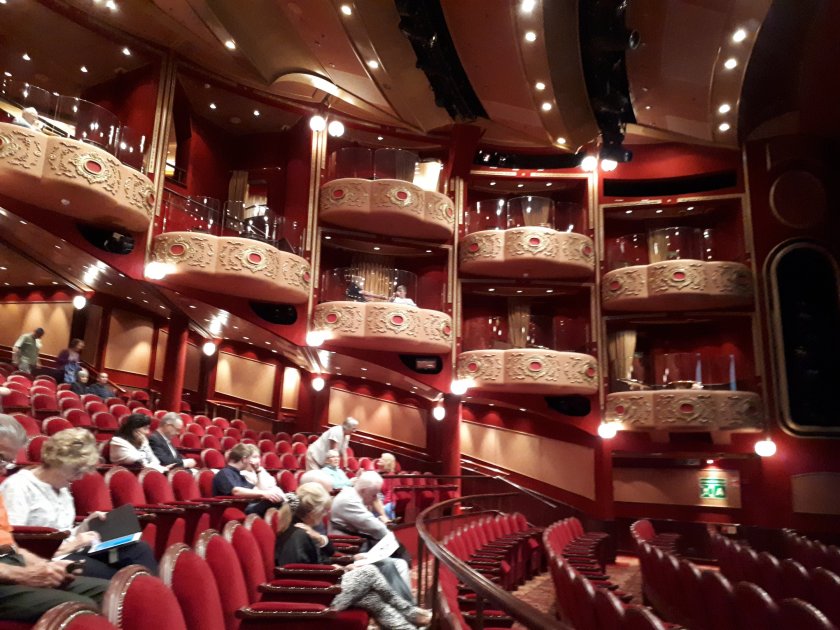 The comedian in the Royal Court Theatre, was well received by an audience thinned out, presumably by the rough seas making moving around the ship somewhat hazardous. I saw no accidents. The stage artiste performed a slick and fluent routine which the audience (and I) enjoyed. Much of his material was of the “old ones are best” variety with plenty of other unfamiliar humour to amuse greatly those who were there.