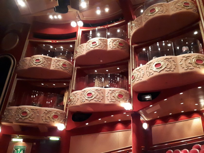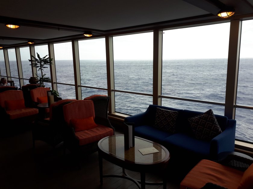 Today the ocean is no mill pond, neither is it particularly rough. It is, however, extremely pleasant to gaze upon, with the sunlight reflected from the sea’s surface. Last night it rained. I joined my table companions in the Royal Court Theatre for a Motown tribute concert, very ably performed by a vocal trio from South East London. The audience responded with standing ovation enthusiasm as did I. After the show, we congregated first in the Yacht Club, and then the adjacent Commodore Club.
