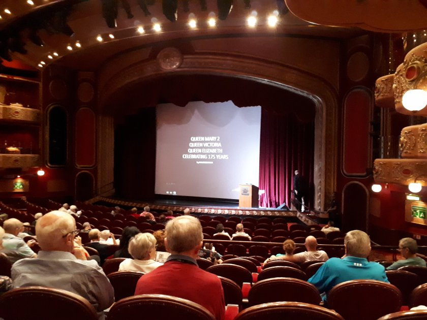 We crossed a ninth time zone this morning, affording an extra hour in bed. This was needed as after dinner, last night, I joined table companions Daphne and Nigel firstly in the Queens Room where passengers danced with the elegance of royalty, and then for a Tia Maria in the Commodore Club. Even so, I still managed to miss breakfast, having instead, a substantial salad of ham, mackerel, and a token slice of brie for lunch. Seats by the window in the Lido are much easier to come by than in Queen Mary 2’s Kings Court. I was joined by a couple both of whom were churchwardens at Coventry. They sail to Auckland from where they endure the flight back to the UK. Rather them than me! Also, much to my delight, I met a Swedish couple from last year’s Queen Mary 2 World Voyage, in the Royal Court Theatre where one time Cunard employee, Maureen Ryan gave a well illustrated presentation on her times aboard the QE2. She remains respected greatly, both by seasoned Cunard passengers and present day personnel alike. Miss Ryan had earned her living, not only on the original Queens Mary and Elizabeth as well as QE2, but also on the second Mauretania, second, and possibly third Caronia (ex Vistafjord) as well as other passenger ships which she mentioned during her talk. Ironically, she bought her own ticket for the last voyage of QE2 to Dubai!