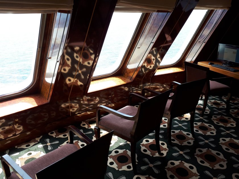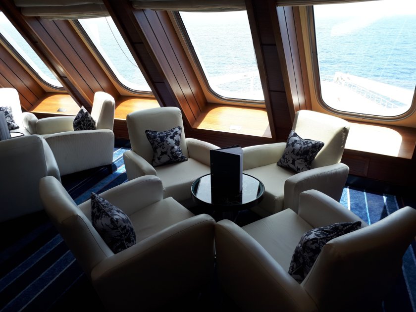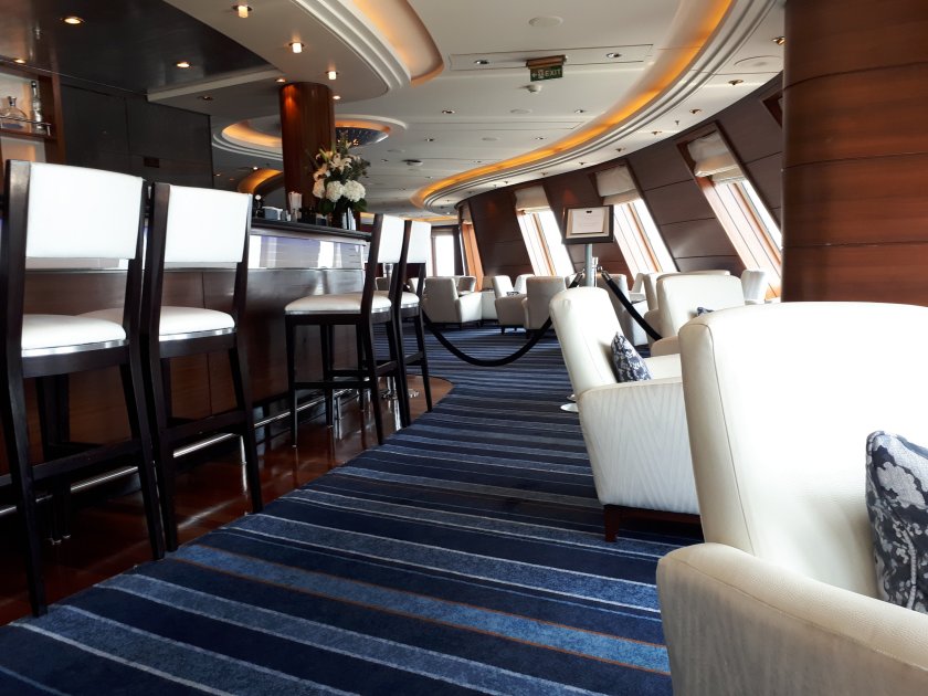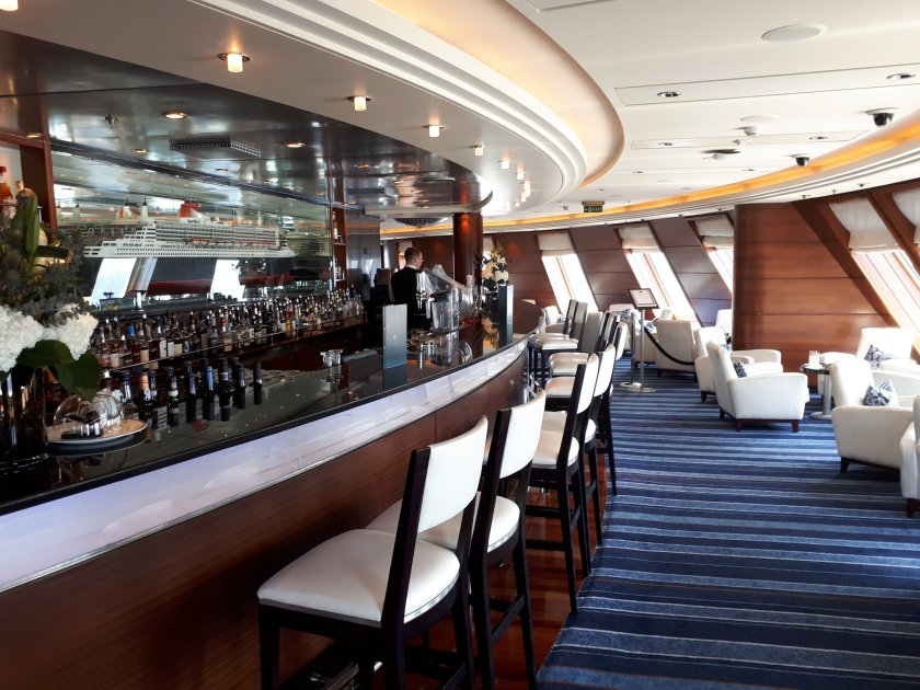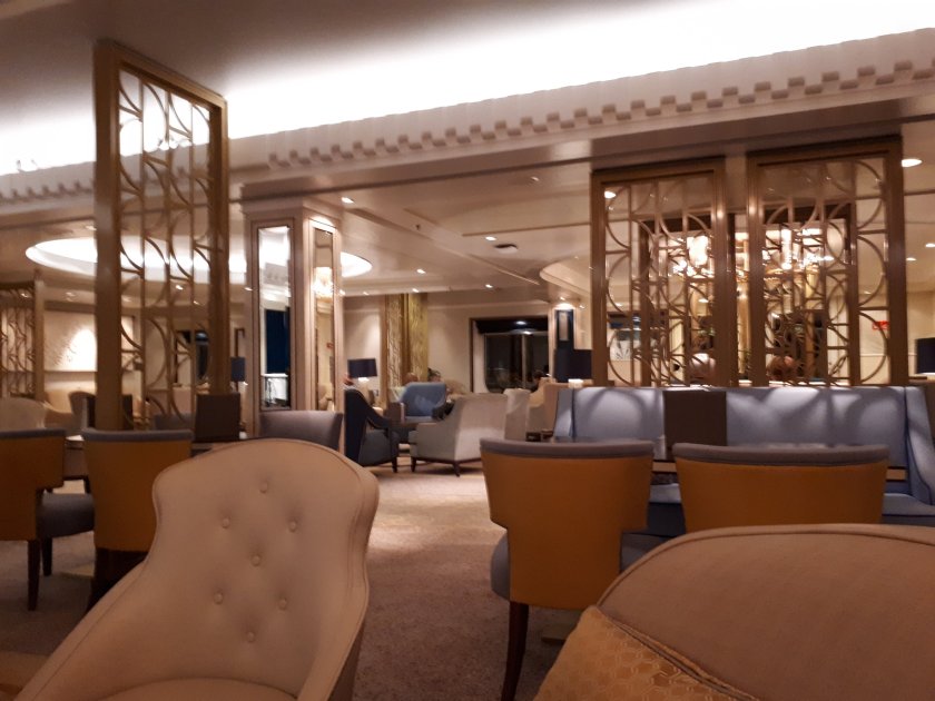 Looking back from what I call the mini-promenade deck, which I know as Deck 14 forward. One of the loveliest bar and lounge areas to be found forward on Deck 9 is the Commodore Club. Here, the most creative and imaginative of cocktails are prepared and can be savoured as one gazes, again on uninterrupted views ahead. Speciality coffees are also on offer. Music plays unobtrusively in the back-ground. Prior to dinner, enticing canapes are served with pre dinner drinks. As darkness falls, the window blinds are lowerd and the Commodore Club takes on the ambience of a sophisticated city bar, complete with live pianist for much of the evening. Even more exclusive is Churchill’s an adjacent room where the smoking of cigars is encouraged.