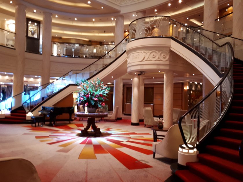Grand Lobby. This is often the first area one sees when boarding QM2 at the start of a voyage.