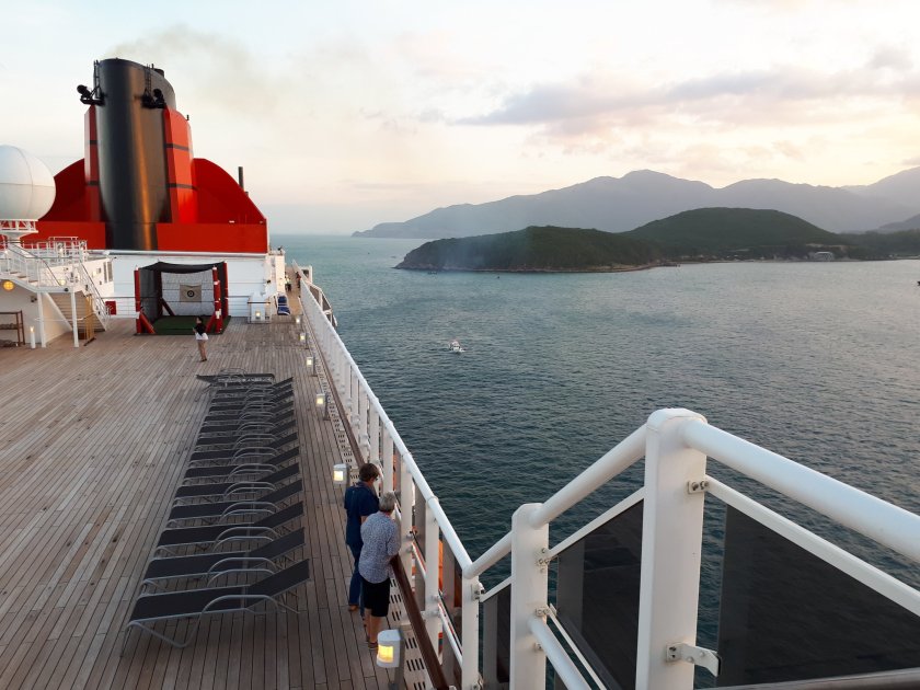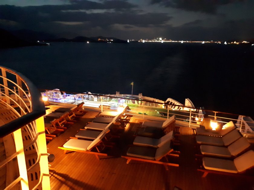 Yesterday evening, the departure from Hong Kong, as the sun set, and the light gradually faded, was magical. At the stern on deck 8, the band played and some people danced. I had seen nothing like it, and was thrilled, particularly with the crescendo of lighting from the forests of high-rises as darkness fell.