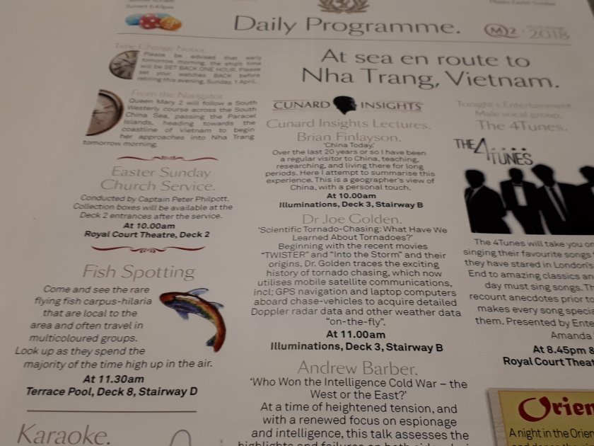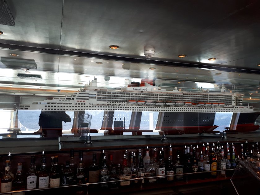 The now famous model of QM2 which has always graced the back wall of the bar of the Commodore Club. Today, our first of two sea days between Nha Trang and Singapore, the clocks were again advanced an hour at noon. It’s time for lunch. The tranquillity of the Commodore Club has been suddenly shattered by the advent of couple of exuberant Americans in loud conversation with an equally flamboyant barman…from north of the Border! At least I enjoyed the first sips of my coffee in peace! To be continued. Thanks for reading. David.