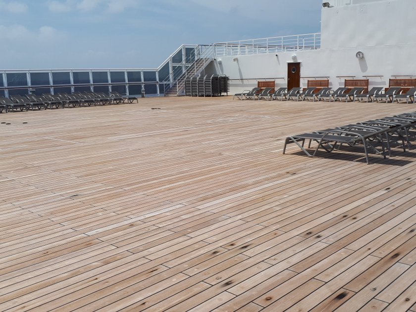Its position on the highest passenger deck is conveniently close to an expansive shipwide space where deck games are available as well as a generous area for sunbathing.