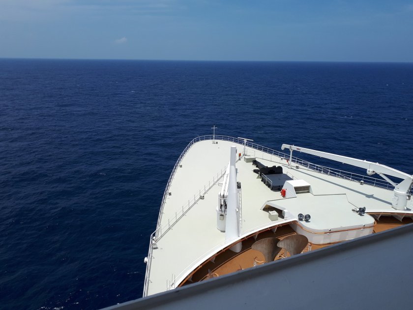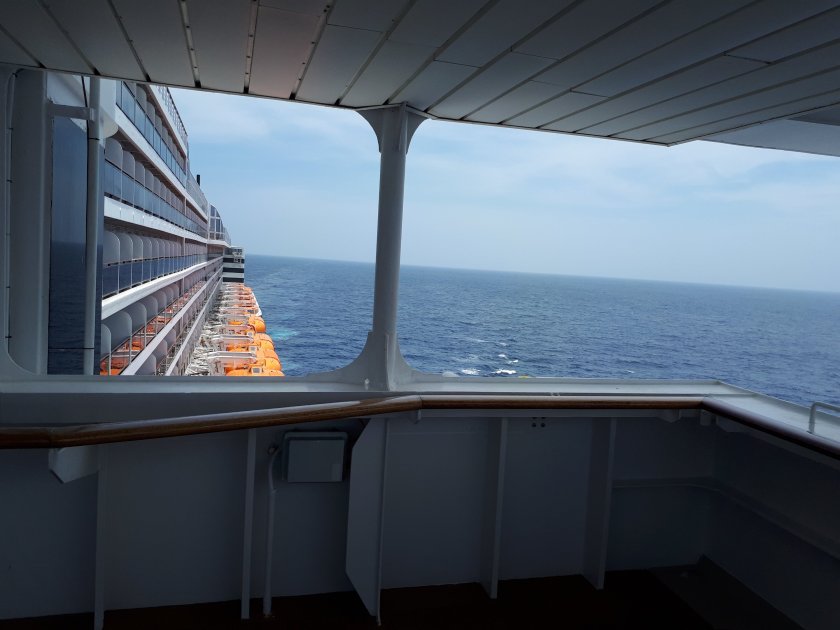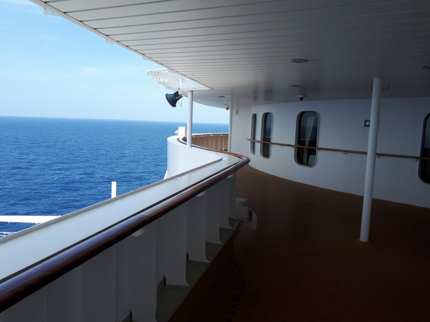 The flight of stairs at the top of the picture, and one opposite, lead to a kind of mini-promenade deck, above the deck 13 cabins which were installed as part of Queen Mary 2’s remastering in June 2016. I feel this offers the finest side views from most places on board. Views forward are obstructed by masts and other necessary ship’s equipment. The Observation Deck in front of the Atlantic Lounge on deck 11, affords wonderful all-round vistas, particularly, when not crowded.