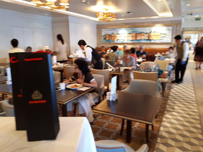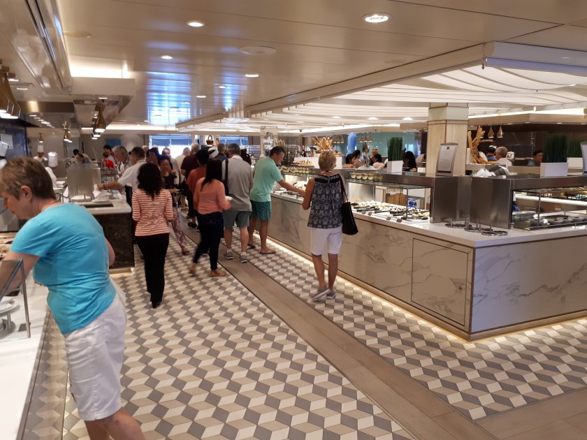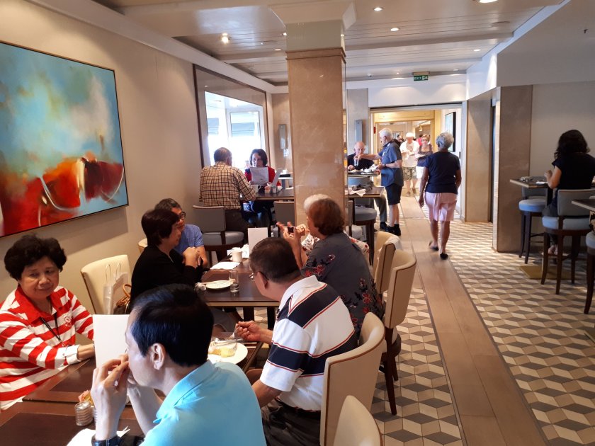 Exiting the Canyon Ranch Spa complex, the adjacent Carinthia Lounge offers a ship-wide comfortable and stylish area to relax and enjoy light snacks as well as the usual drinks from the bar and speciality coffees. Live music, usually at around 5pm adds to the pleasure of spending time here, possibly engrossed in a novel. Keep moving further along and enjoy the “everybody everywhere” bustle of the Kings Court. From the early hours to 2am the following morning, the widest selection of excellent cuisine is available at early and late breakfast, lunch, afternoon tea, snacks in between, dinner, and even a hot and cold range available to when most people are fast asleep. There are still guests and personnel around at that time, justifying staying open until the early hours. Night staff ensure all is ready for reopening in just a few hours.
