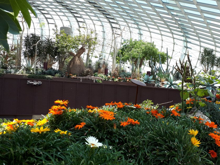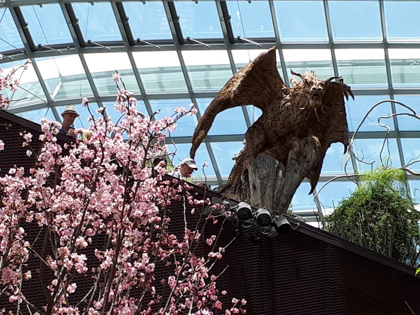That was unfortunate….I forgot to load the battery into my main (Lumix) camera. The up-side is that all but a handful of pictures taken after I returned to the ship are on my ‘phone, the best of which can be shared on this blog. I did two things today; this morning, I gave the Canyon Ranch Spa a try. For the first time in my life, I immersed myself in a magnificent jacuzzi, and then, (not the first time) sweated it out in a steam room. I also braved the swimming pool, confident that being 5ft. deep I, a non swimmer, could stand on the bottom. Refreshed, I returned to my stateroom with just enough time to prepare for this afternoon’s shore excursion “Gardens by the Bay and Afternoon Tea)”. This was a treat. Gardens by the Bay are a complex of huge glass covered “domes”, housing hundreds of plants and species in a controlled environment in which they can thrive. I suppose it’s a bit like the Eden Project in Cornwall, but several times larger. In the same location are a number of huge tree like structures. They serve several purposes including water gathering during wet weather. One of these trees, the tallest, houses a splendid restaurant near the top, I believe 53 metres from ground level. An observation deck affords aerial views through the tree’s branch like structure, and atop a further flight of stairs, clear views can be enjoyed at that higher level. Afternoon Tea took the form of a small oriental buffet which I enjoyed thoroughly. The flower and other displays in the futuristic glass structures defy adequate description. There were other areas including a section warning in graphic detail man’s contribution to the now serious state of our planet, and the present day effects of global warming, forest exploitation, and all sorts of other human activities.