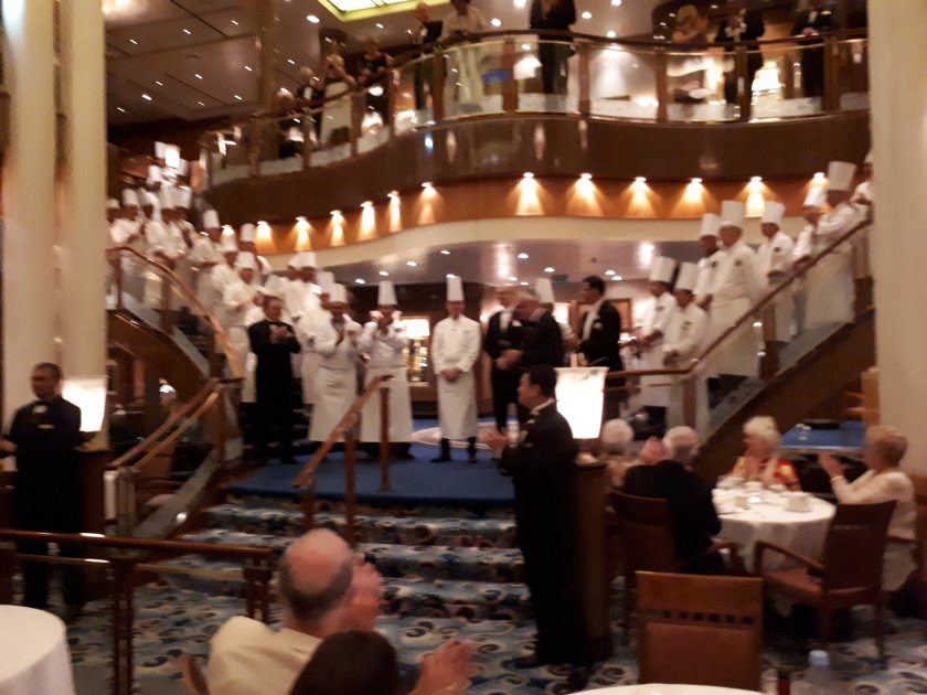 The Parade of Chefs, Britannia Restaurant second sitting, Sat. 10 Feb. 2018. Today is bright, windy on the outside decks with slightly choppy seas; Force 5 with 2 metre waves. I attended the Captain’s church service this morning. It wasn’t too bad, The Captain brought interest to this maritime Act of Worship, as he does when he addresses his “guests” at noon each day. Collated, these noon day addresses would make a worthwhile, informative and fascinating read. I am now away from home longer than at any other time in my life. There remains a further three months! This reality can feel, occasionally, quite daunting, especially at night. But, fortunately, this is very infrequent. Last night, I watched the new film “Murder on the Orient Express”, a superb all star cast re-make. My only criticism was the train’s unrealistically short formation. Although filmed, already, many times, this was a worthwhile and enjoyable re-working. Earlier in this seven day crossing, I had entered a number of what I thought were worthy photographs taken during the Garden Route Safari overland tour, in an on board photography competition. I went down to the photo shop to see that my efforts pailed into insignificance alongside the commendable creative efforts of other competitors. I won’t give up; opportunities in Australia and New Zealand abound! More writings soon. For some reason, I am finding it less easy to keep the journal up to date; notes being abbreviated to be expanded upon at a later date. More from Down Under soon! David